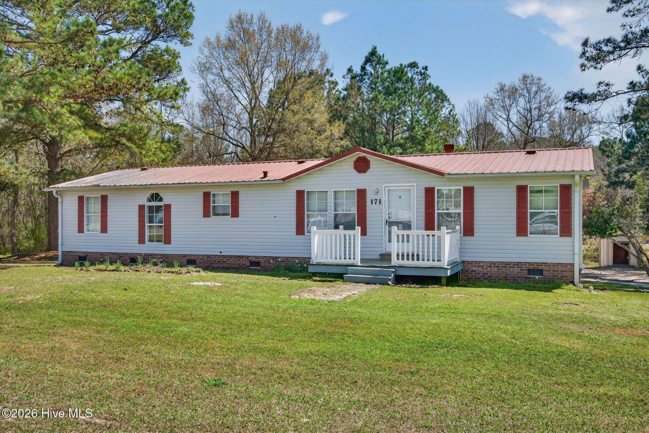 Investors, flippers, and savvy buyers--here's your opportunity at 171 Big Four in Curry, NC. This 1,428 sq. ft. manufactured double-wide sits on a spacious lot with no HOA and no restrictions, offering plenty of upside for the right buyer. Priced to reflect its current condition and being sold as-is, this property is a strong option for anyone looking to renovate, add value, or build equity over time.The home is currently livable while improvements are made and features a functional, spacious layout. The living room offers a vaulted ceiling and stone-surround fireplace, while the kitchen includes white cabinetry, a dishwasher, and double sink. The primary suite features a walk-in closet and private bath with a corner soaking tub and large vanity. Two additional bedrooms are located on the opposite side of the home for added separation and flexibility.Several major items are already in place, including a metal roof and newer HVAC system, helping reduce some immediate capital expenses. The property is served by well and septic, with the septic pumped in 2024. Cosmetic updates are needed throughout, including flooring, paint, and fixtures, and the pricing reflects that opportunity.Outside, the large lot offers mature trees, usable outdoor space, and room to expand or improve. For buyers considering a renovation loan or cash purchase, this is a chance to secure solid square footage and land in Pender County at an accessible price point. Schedule your showing today.