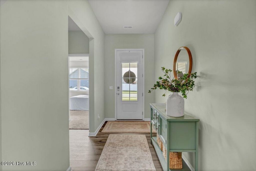 With over 2,000 heated square feet, a spacious open layout, and a screened porch overlooking a fenced back yard, this one-story home in Grayson Park offers plenty of room to enjoy both indoors and out. The home features 4 bedrooms, 2 bathrooms, an oversized screened porch, and a 2-car garage (refrigerator in garage conveys). The back yard borders a wooded area, adding a natural backdrop to the outdoor living space. Inside, luxury vinyl plank flooring runs throughout the main living areas. The kitchen includes a large island, pantry, white Shaker-style cabinets, and granite countertops, while the attached dining area can accommodate a table for 6. The living room offers ample wall space for a media center and flexible furniture placement. The primary suite features a tray ceiling, two walk-in closets, a double-sink vanity, a linen closet, a water closet, and a walk-in shower. Three guest bedrooms share a full bathroom with a tub/shower combination. Smart home technology adds convenience to daily living, with built-in controls for the front door lock, porch light, and thermostat. Grayson Park amenities include a clubhouse, swimming pool, fitness center, playground, and tennis courts. The community is also centrally located with easy access to Highway 140, Leland shopping and dining, and downtown Wilmington.